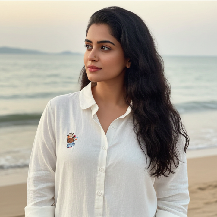 Add charm to your everyday style with our Balloon Belle embroidered cotton shirt. With a playful balloon collar and an adorable girl patch, this shirt is made for dreamy days and casual chic looks.